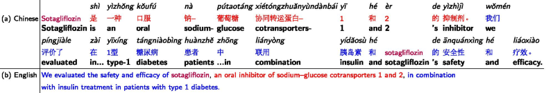 Table 3 An example 1-to-2 alignment for clause breaking. The red text denotes the English clause corresponding to the first Chinese sentence. Sotagliflozin is cited once in the English sentence, but repeated in two Chinese sentences